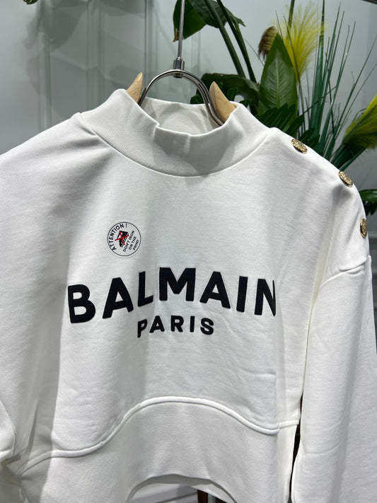 Cropped white sweatshirt with Balmain Paris Print for women