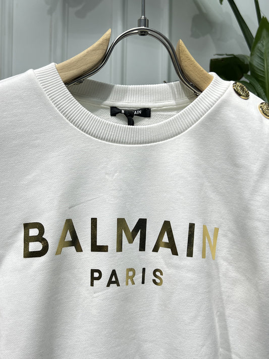 White sweatshirt with gold Balmain Paris print for women